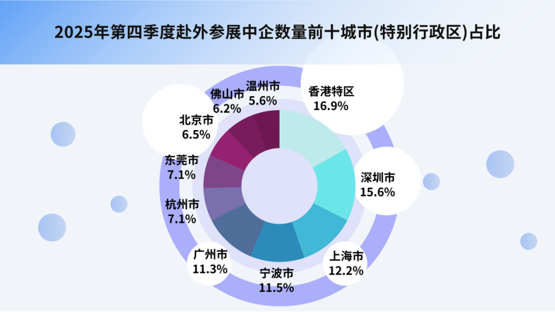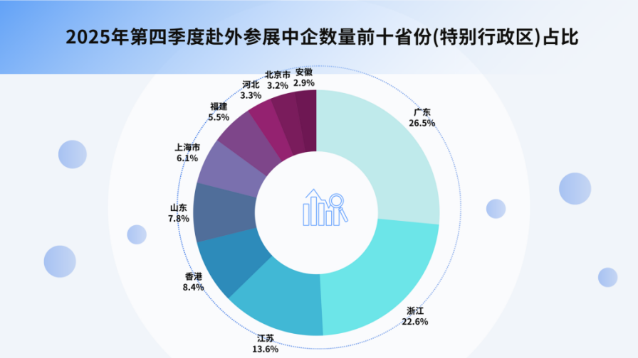 对比2024年同期,2025年第四季度中企赴外参展呈现五方面变化。具体从省份、行业、展会、国家和地区、城市五个维度展开分析。