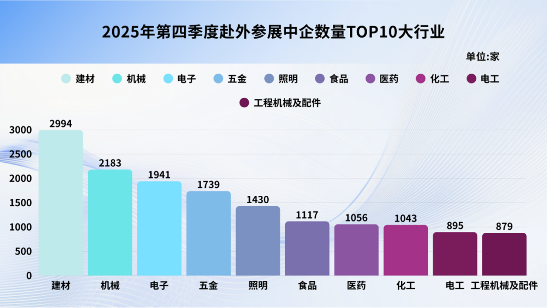 这一特征可通过第四季度赴外参展中企数量TOP10大行业情况得以体现。这十大行业分别为:建材(2294家)、机械(2183家)、电子(1941家)、五金(1739家)、照明(1430家)、食品(1117家)、医药(1056家)、化工(1043家)、电工(895家)、工程机械及配件(879家)。同时,第四季度赴外参展中企数量TOP10的小行业数据亦值得关注,分别为:其他电子(1101家)、其他照明(688家)、塑料(534家)、建筑玻璃(505家)、医疗设备(390家)、门窗五金(374家)、其他工艺品礼品(360家)、其他五金(342家)、其他食品(282家)、家用电器(274家)。
