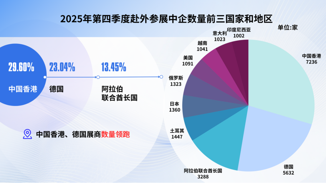 2024年第四季度,德国凭借6269家内地参展企业的数量,领先于中国香港的5546家,位居首位。2025年第四季度同比数据显示,中国香港以7236家内地参展企业的规模反超德国的5632家,成功跃居榜首。
